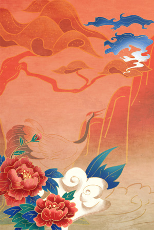 传统中国风插画:丹顶鹤与牡丹花