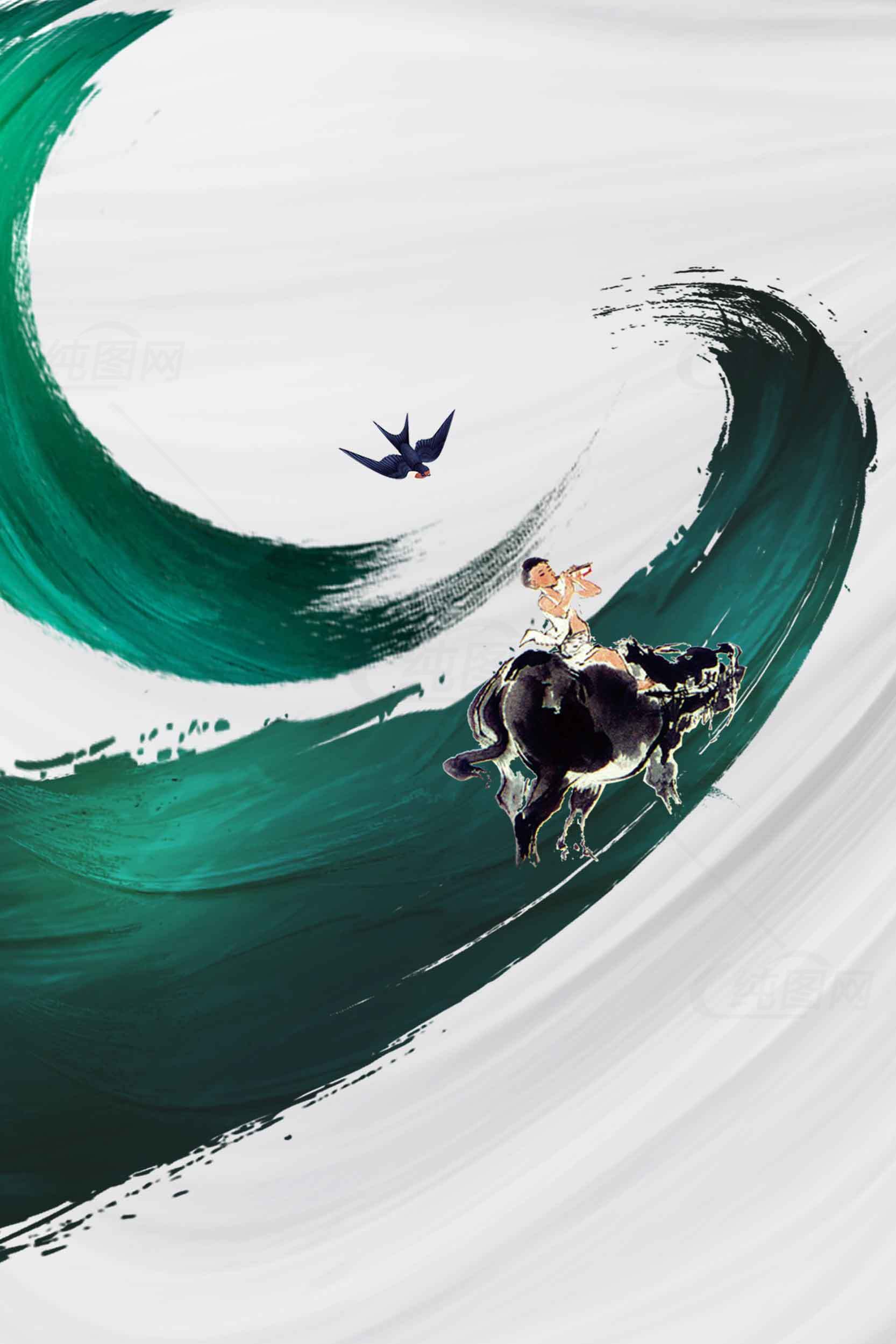 这张作品的主题是:国风水墨画:牧童骑牛与飞鸟意境图,以绿色为主色调,主体文字图片皆可替换修改,您可能还对诗意画面,田园风光,艺术设计,古典美学,牧童图,牛与自然,动态画面,现代国画,传统文化,水墨艺术等内容感兴趣,国风水墨画:牧童骑牛与飞鸟意境图格式为PSD,作品编号:12373,尺寸为2363*3543像素,海报素材大小是24.297M。欢迎会员免费下载。