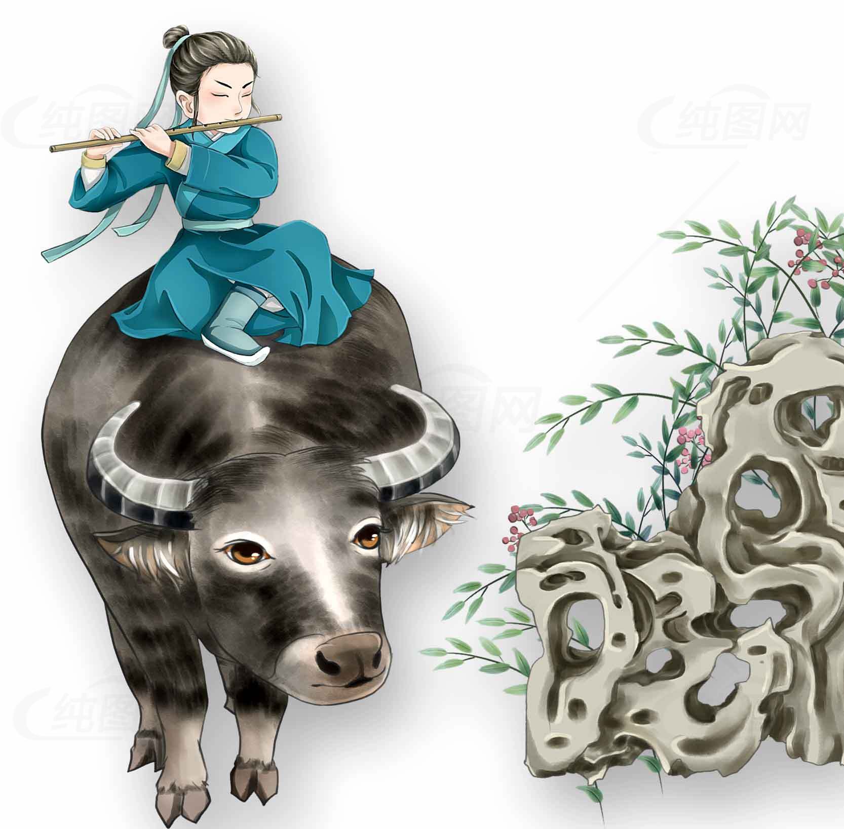牧童骑牛吹笛插画 - 中国传统田园风光
