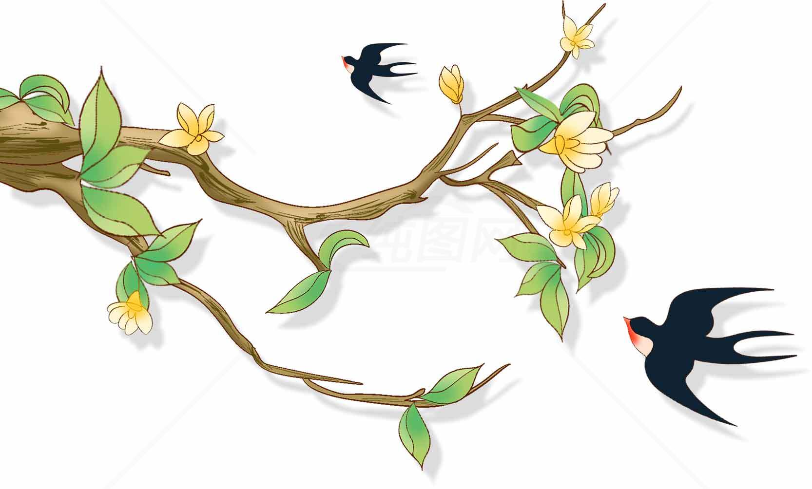 春日柳枝上的燕子手绘插画