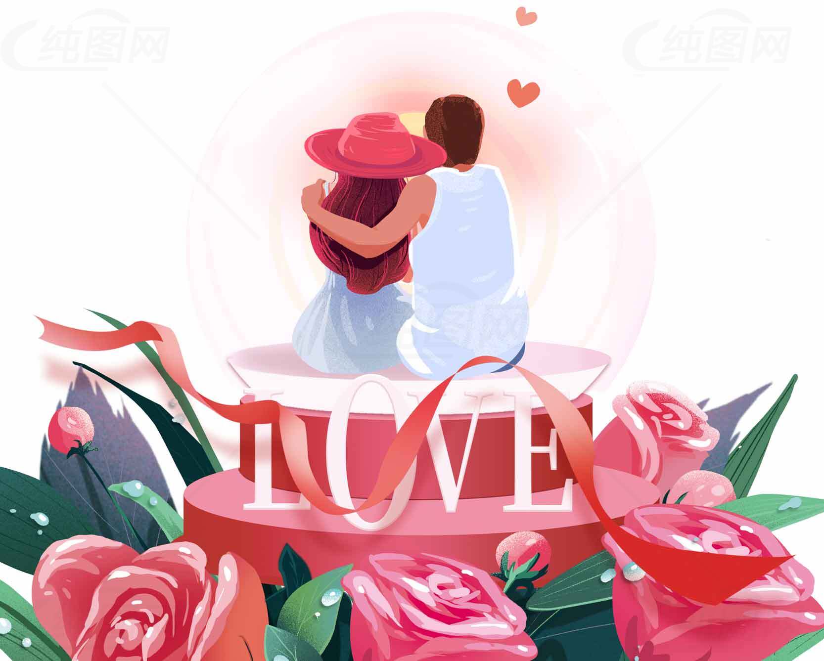 浪漫插画情侣拥抱与玫瑰花意境图片