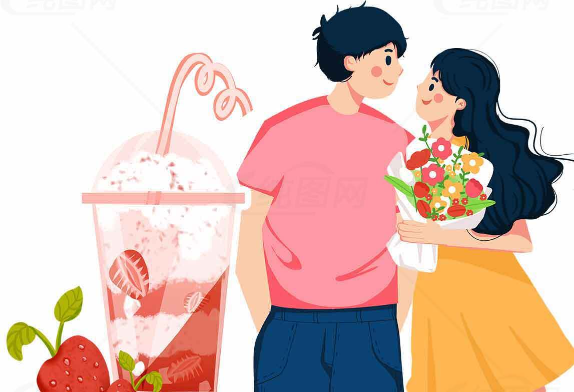 浪漫情侣插画:甜蜜爱情与花束的表达